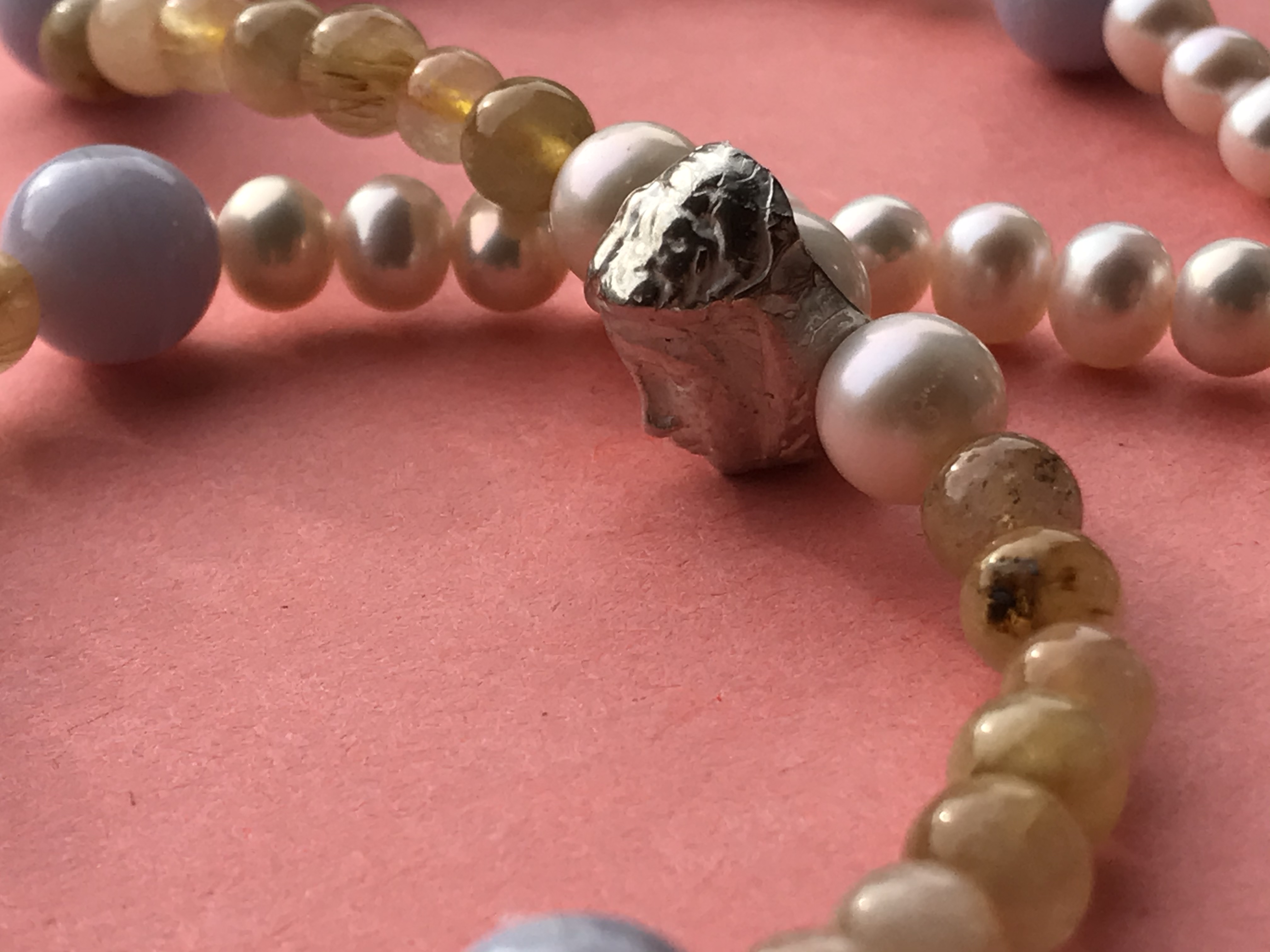 Enfilado a mano, este collar consta de piezas de plata 925 hechas a mano y también perlas, calcedonias y cuarzos rutilados.